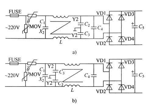 電源浪涌電流抑制電路 上電時(shí),由于濾波電容器的電壓基本為零(相當(dāng)于短時(shí)短路),如果正好是電源適配器電壓峰值,則輸入電流峰值為輸入浪涌峰值電流值,為輸入電壓峰值除以線路內(nèi)阻,線路內(nèi)阻通常很小,將產(chǎn)生數(shù)10倍正常電流的浪涌電流,即使在城市民用供電條件下,浪涌電流峰值將達(dá)100A,即使在電源適配器電壓過(guò)零時(shí)上電仍有約10倍的浪涌電流。 上電浪涌電流的危害:出現(xiàn)浪涌電流時(shí)造成電源適配器電壓波形塌波,造成供電質(zhì)量變差,甚 至?xí)绊懫渌秒娫O(shè)備的工作以及供電電流的保護(hù)電路動(dòng)作:由于浪涌電流的沖擊整流器輸入熔斷器在若干次上電過(guò)程的浪涌電流沖擊而非過(guò)載/短路熔斷?為避兔這類現(xiàn)象發(fā)而不得不選用更高額定電流的熔斷器,但將出現(xiàn)過(guò)載時(shí)熔斷器不能熔斷,起不到保護(hù)整流及用電電路的作用;過(guò)高的上電浪涌電流對(duì)整流器和濾波電容器造成不可逆的損壞?因必須對(duì)帶有電容濾波的整流器輸入浪涌電流加以限制?