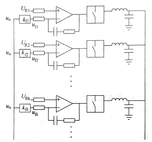 所有120w電源適配器輸出連接在一起,因此它們的輸出電壓a?都是相同的,但每個電源適配器的給定量Un?反饋比例系數(shù)ka略有差異,再考慮到運放的失調(diào)電壓也不盡相同,因此各電源適配器誤差信號c=Um-k?也各不相同(本小節(jié)中下角標(biāo)k均表示第k個電源適配器)?各電源適配器的電壓調(diào)節(jié)器通常都采用比例一積分(P)調(diào)節(jié)器?