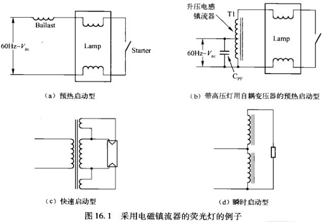 從1938年至20世紀70年代末期,燈飾都是直接由60Hz的工頻電源適配器,通過一個串連電感或一個60Hx的升壓變壓器/電感的組合來驅動的。這個電感或者變壓器/電感的組合就是常說的電磁鎮流器,如圖所示。
