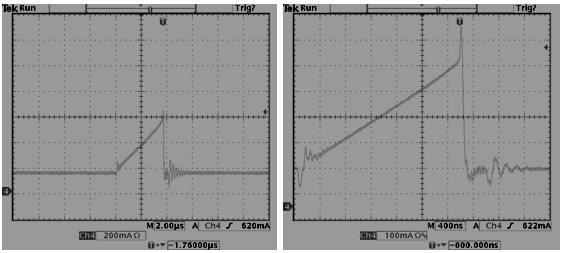 10.反激拓補結構,變壓器B值需小于3500高斯,如果變壓器飽和一切動作將會失控,如下左圖為正常,右圖為飽和。