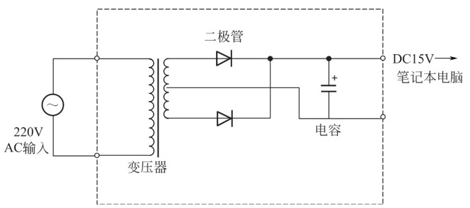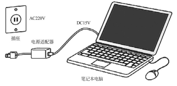 如果筆記本電腦配備的電池可以無限時間地使用,筆記本電腦就可不需要外部電源適配器供電,但是這種理想的電池是不存在的。所以需要把交流市電變換為直流電源適配器,在使用筆記本電腦時,其外部電源適配器接線如圖1-8所示。AC220V的插座和筆記本電腦之間,需要如圖1-9所示的DC15V輸出(通常需要15V電源適配器)的電源適配器。雖然通過交流整流或者電池可以實現,但是交流電壓有變動,電池在充放電狀態時電壓也有較大的變動。