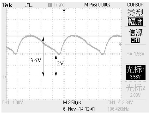 目前許多打印機使用自激式電源適配器,根據功能和打印方式的不同,打印機可分為針式打印機、票據打印機、噴墨打印機、激光打印機等多種。圖3-33為惠普HP1018激光打印機電源適配器原理圖,主要由市電交流輸入及轉換、定影系統供電、主電源適配器等電路構成。各部分電路工作原理如下。![]() 1.市電輸入及轉換 電源適配器輸入電路是指高頻干擾抑制、整流和濾波電路。其作用是把電網的工頻交流電轉換為平滑的直流電,給電源適配器提供輸入電壓,并抑制和濾除輸入端的高頻雙向干擾。有關輸入電路各元器件的作用可參見第2章中的表2-3。 2.定影系統供電及控制 通電后,打印機CPU經由接插件J201的19、21腳送入高電平,因J201的7腳為+5V(來自于主控板),VT102與VT103均導通。其中,VT102導通,經光耦SSR101(3SF21)給雙向可控硅VT101(BCR5KM)提供觸發信號使其導通;VT103導通,繼電器RL101觸點吸合,此時市電通過接插件J101為陶瓷片供電加熱。當加熱陶瓷片的溫度達到185℃左右時,接插件J201的19腳變為低電平,VT102截止,VT101關斷,陶瓷片加熱停止,與此同時,微處理器發出指令使“準備好”燈點亮。 另外,該機具有節能功能。如果在設定時間內打印機仍未工作,則接插件J201的21腳變為低電平,VT103截止,繼電器RL101觸點釋放,機器進入待機狀態。二極管VD105反并聯于繼電器RL101供電線圈兩端,在VT103截止時吸收線圈瞬間感應電壓,對VT103起保護作用。 雙向可控硅VT101主回路兩端并聯的SQ101是一個阻容串聯復合體,復合體電阻為120Ω,電容為0.1μF/AC275V。在可控硅關斷瞬間,阻容復合體吸收感性負載的瞬變高壓(也可以理解為“剩余能量”)保護可控硅。這種阻容復合體吸收電路在交流市電的可控硅供電系統中已經成為必選。 3.主電源 該機是由功率管VT501(2SK2700是MOSFET)和開關變壓器T501為核心構成的自激式電源適配器。 (1)開關管VT501的開關過程 輸入整流濾波電壓約為300V:一路經保險電阻R523(0.22Ω)、T501主繞組NP加到開關管漏極(D);另一路經R501~R503給VT501提供啟動電壓。輔助繞組NA經阻容元件與開關管VT501組成振蕩電路,VT501是開關管兼振蕩管。高壓電容C501(680pF/1kV)并聯在VT501的漏—源極之間,用于抑制VT501關斷瞬間NP產生的浪涌電壓。 VT501導通時,NA同名端(黑圓圈)為正極性電壓:一方面經R504、R505和C502送到功率管柵極加速其導通;另一方面經R506給C503充電,C503兩端電壓約為0.6V時VT502開始導通,并聯于VT502發射結的電容C503兩端正電壓被鉗位。由于C503充電時間常數較大,故在VT501導通一段時間后VT502才導通,降低VT501柵極與源極之間的電壓,VT501漏極電流減小,變壓器所有繞組電壓極性反轉。NA同名端負極性的電壓一路經R504、VD502和C502(VD502旁路R505)加到VT501柵極加速其截止;另一路經R507和VD503給C503放電(R506阻值較大,被R507和VD503旁路),促使VT502退出導通,轉為截止。繼續放電約為-0.6V時VD501開始導通,此時電容C503兩端負電壓被VD501鉗位。 圖為某負載時以A點為參考零電位時測得的功率管柵極(G)電壓波形??梢姡瑬艠O電位(G)始終高于A點電位,振幅約為1.6V。 ![]() 由上述分析可知,VT501柵極通路電容C502充、放電的通路不同,VT502發射結并聯電容C503充、放電的通路也不同,它們均是充電時間常數大、充電慢,放電時間常數小、放電快。C502的充電時間設定了開關管VT501導通的較大脈沖寬度,在此脈寬之內受控于脈寬調制管VT502;其充電慢、放電快有利于VT501快速截止。C503充電慢是為了滿足VT501具有較大導通脈沖寬度,放電快是便于進入下一個控制周期。 (2)穩壓控制 整流管DA501是共陰極(肖特基)二極管,FU501是延時型可恢復保險絲(防止輸出短路)。整流后的脈動電壓經由C506、L101和C507組成的π形濾波器變成紋波很小的直流電。 穩壓電路受光耦PC501和集成運放IC501B控制。R517與ZD501產生4.6V基準電壓,經R525加到IC501B反相端(5腳),輸出電壓經R513、R521、R522(9)和R514串聯產生采樣電壓,經R515加到IC501B同相端(6腳)。由于某種原因導致輸出電壓升高,則IC501B同相端(6腳)電壓升高,輸出端(7腳)電壓隨之降低,光耦PC501光電二極管發光增強(導通電壓約為1V),光電晶體管的等效電阻減小。此時,VT501柵極正脈沖電壓經R508、PC501對C503充電速度加快,VT502提前導通,VT501提前截止,占空比變小,輸出的電壓隨之下降,從而實現穩壓控制。由于某種原因導致當輸出電壓升高,有關節點電壓的變化趨勢如圖3-35所示中的①~⑥,即輸出電壓意外上升后,經一系列反饋,后面導致占空比減小,從而保持輸出電壓穩定。 ![]() 由上述工作原理分析,則輸出電壓UO為 ![]() 式中,4.6V為穩壓二極管ZD501的參數。代入原理圖中有關元件參數可得 ![]() 電路中,R512與C508串聯后,并聯在IC501B同相輸入端與輸出端之間用作頻率補償。 (3)過壓保護 過壓保護電路主要由IC501C和光電耦合器PC502組成。R528與ZD503組成二極管穩壓電路加到IC501C反相端(9腳),電壓為4.6V;輸出電壓經R529和R530采樣加到IC501C同相端(10腳)。 當集成運放IC501B或光耦PC501出現異常,引起電源適配器輸出電壓接近大約30V[4.6×(1+R529/R530)]時,IC501C的同相端(10腳)接近4.6V,IC501C(8腳)輸出高電平(實測為7.5V),經R527加到光耦PC502的1腳,PC501接替PC501控制VT502,進而影響功率管VT501,穩定30V電壓不再上升。 VT502是脈沖寬度調制管,其較大脈寬受制于C503的充電時間,影響因素正反饋繞組Na、光耦PC501和PC502;C503并聯于VT502的發射結,故C503的慢充、快放模式決定著VT50