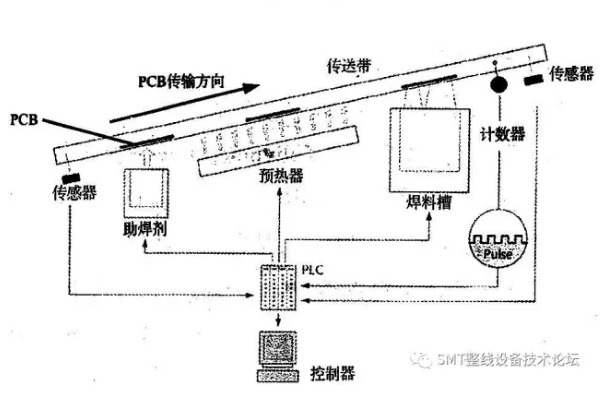 當完成點膠(或印刷)、貼裝、膠固化、插裝通孔元器件的PCB線路板從波峰焊機的入口端隨傳送帶向前運行,通過焊劑發泡(或噴霧)槽時,印制板下表面的焊盤、所有元器件端頭和引腳表面被均勻地涂覆上一層薄薄的焊劑。