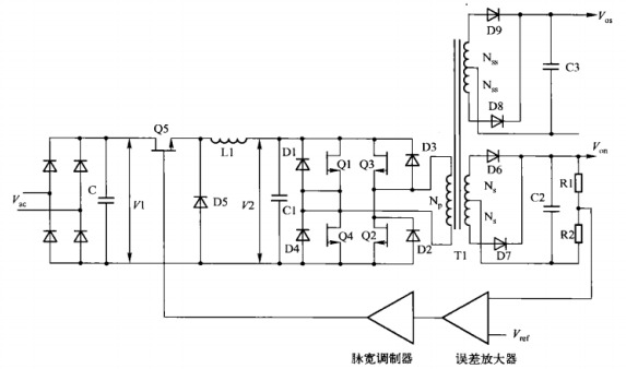 補充:本例中所用變換器為正激型拓撲,副邊電流折射到原邊,通過檢測流過Q1和Q2的公共電流,電流內環有效控制輸出電感L的電流。電流內環通過逐周期調節保持L的峰值電流恒定,僅在緩慢地響應輸出電壓調整時調節電流。因此,將L、的峰值電流作為控制參數,這就將L排除在電壓外環的小信號傳遞函數之外,使得閉環響應速度更快。同時,由于電流為控制參數,使得限流和短路保護成為電流模式控制的固有特性。又由于電流被逐周期控制,因此可以有效控制Q1和Q2電流不平衡,變壓器T不存在飽和問題。并且,輸入電壓的任何變化都被L上的峰值輸出電流(變化)抵消,因此變換器具有優良的網壓調節性能。