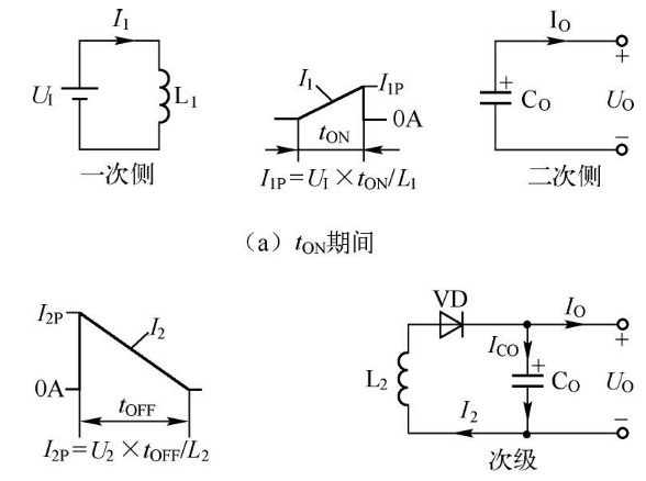 圖為自激式電源適配器的分時等效電路。L1、L2分別為一、二次繞組的電感。圖(a)為tON期間開關管VT導通,T一次繞組兩端所加電壓為UI;tON即將結束時,一次繞組的電流達到峰值,即