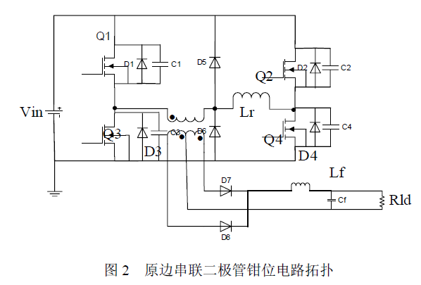 在實現滯后橋臂的同時,為了進一步擴大負載范圍,可在原邊上再串聯上一飽和電感,該電路可減小占空比的損失和減小變壓器副邊的寄生振蕩,但是飽和電感工作在正、負飽和值之間,而且頻率很高,使得飽和電感的損耗較大,在低的輸入電壓情況下會引起較為嚴重的副邊占空比丟失。 2.2 原邊串聯二極管鉗位電路及其改進電路 上述電路雖然實現了全橋移相電路的ZVS,但是并沒有很好地解決輸出整流二級管在反向恢復過程中的電壓尖峰問題,基于此有文章提出了鉗位電路(如圖2)