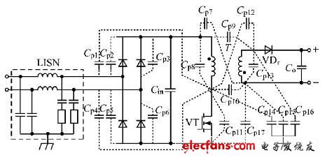 圖2反激式開關電源寄生電容典型的分布