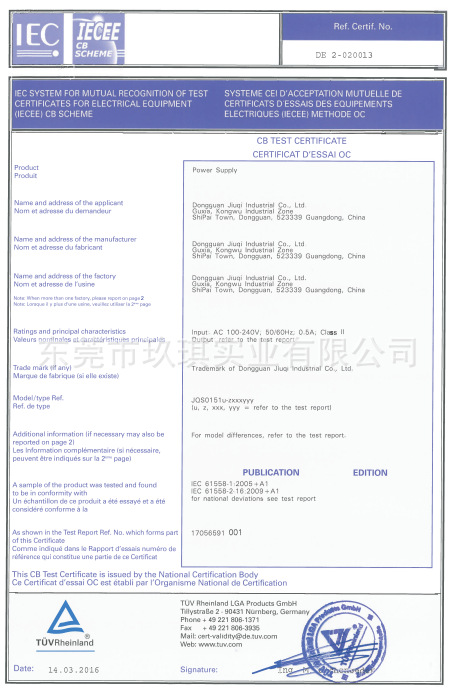 網站首頁 » 產品展示 » 產品認證 » 15W證書 » CB安規證書-15W系列電源適配器